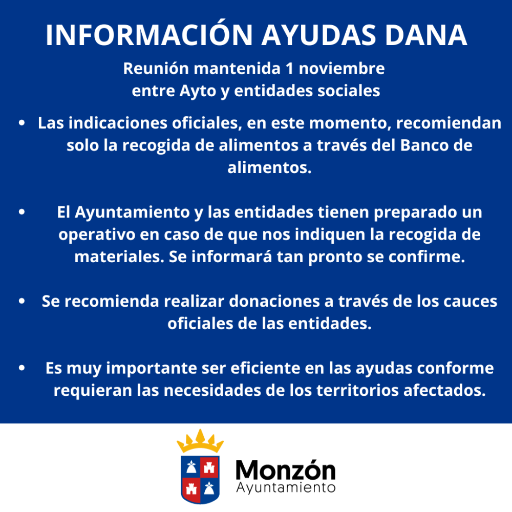 El ayuntamiento de Monzón, con representantes de los diferentes partidos políticos, junto con Cruz Roja y Cáritas Diocesana Barbastro-Monzón han mantenido una reunión de trabajo para valorar y coordinar la ayuda a los territorios afectados por la DANA.