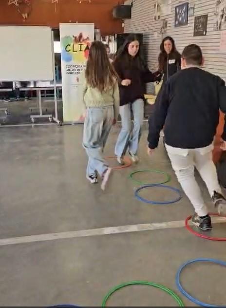 Para activarnos, realizamos dos juegos. Primero tuvimos que ordenarnos por fecha de cumpleaños, sin tener en cuenta la edad, y después nos dividimos en dos grupos para jugar a “Media luna”, un juego por equipos basado en piedra, papel o tijera, utilizando aros a modo de carrera.