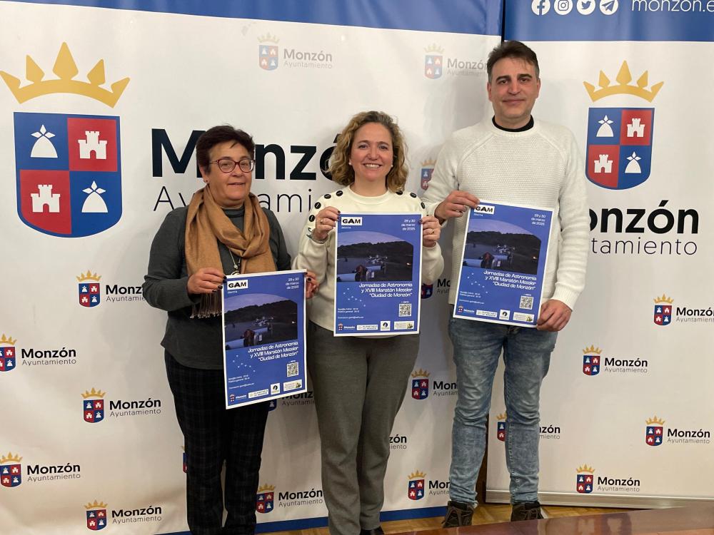 La concejal de Cultura, Marta Montaner Durán, y los representantes del Grupo Astronómico de Monzón de la Asociación Astronómica de Huesca, Ana Falo, y Abel Laporta, han presentado este viernes en el Salón Azul las Jornadas Astronómicas y el XVIII Maratón Messier, que se desarrollarán el fin de semana del 29 y 30 de marzo en el Auditorio San Francisco y Hoz de Barbastro, respectivamente.
