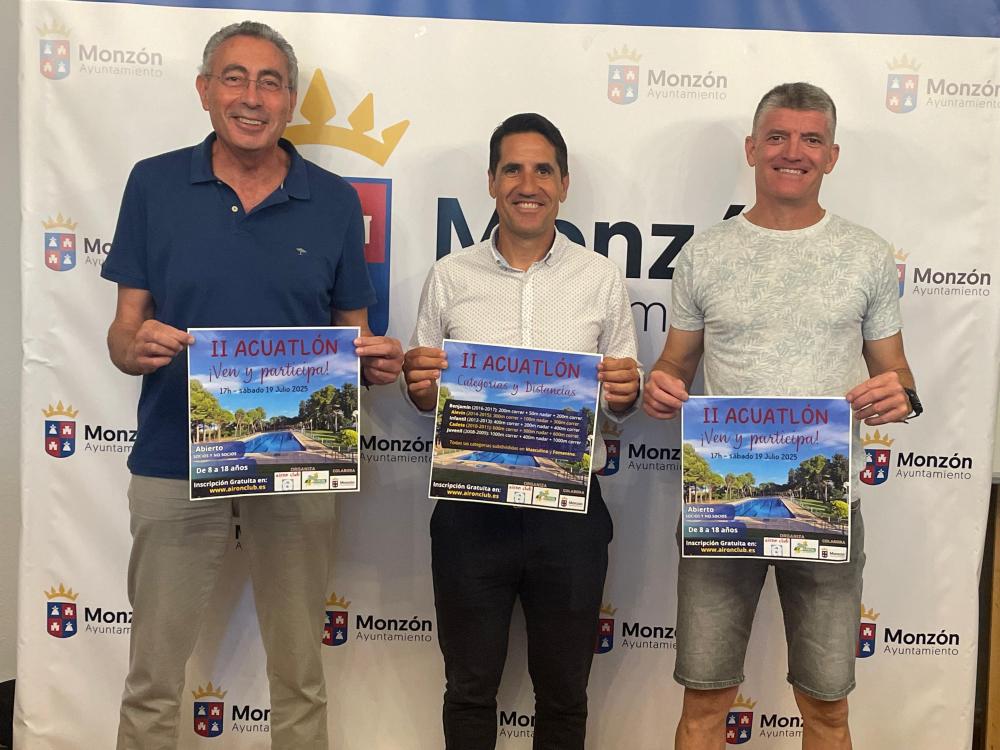 El concejal de Deportes del Ayuntamiento de Monzón, Eliseo Martín, y los representantes de Airon Club, Melchor Sarrado, y de Biofrutal Sport, Sergio Brazo, han presentado este viernes en el Salón Azul la segunda edición del Acuatlón Monzón, que se celebrará el sábado, día 19 de julio, a partir de las 17:00h, en las piscinas de Airon Club con una participación máxima de 75 deportistas con edades comprendidas entre los 8 y los 18 años.