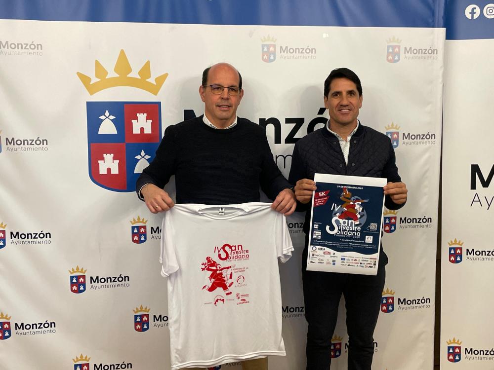 El concejal de Deportes del Ayuntamiento de Monzón, Eliseo Martín, y el secretario de la Asociación de Vecinos de la Fuente Saso, Jorge Chárlez, han presentado en el Salón Azul este miércoles la IV San Silvestre Solidaria Fuente del Saso, que se celebrará el día 29 de diciembre, a partir de las 10:30h para los peques y 11:30h para la categoría absoluta, a favor de la Asociación de Familiares de Enfermos de Alzheimer y Otras Demencias de Monzón (AFEDAM), que ha cumplido 25 años.