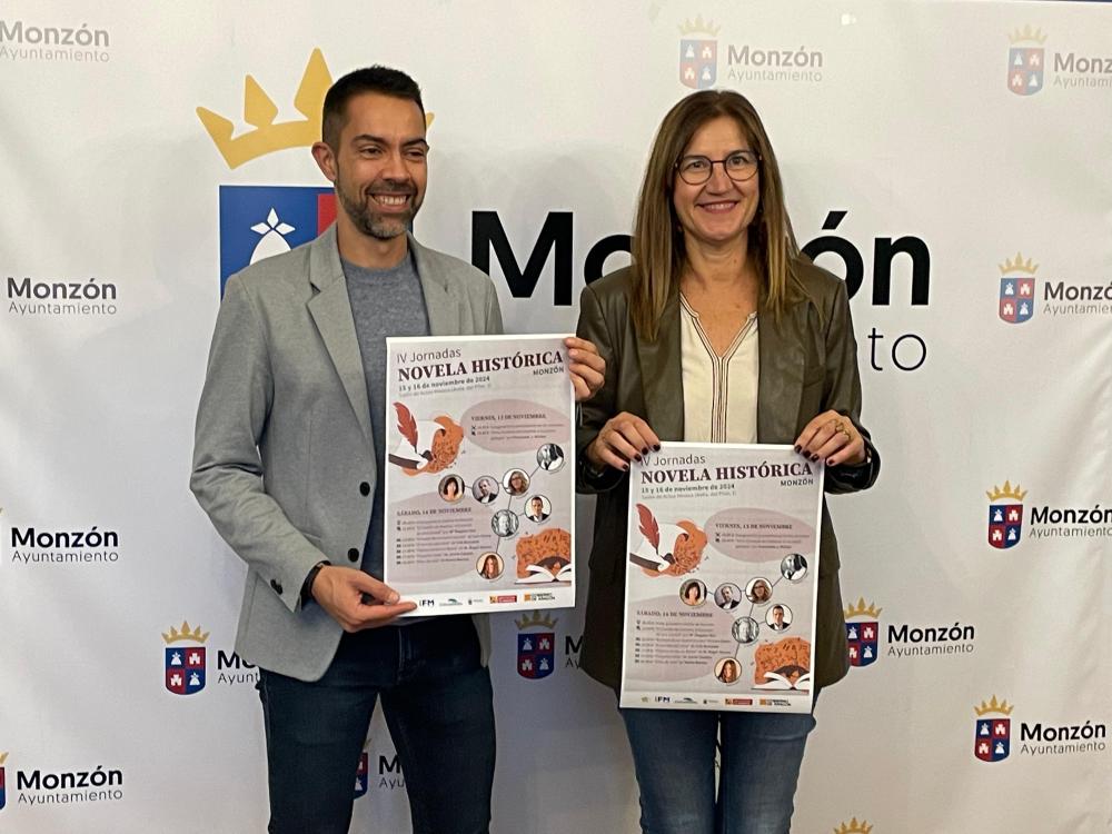 El concejal de Ferias, Jairo Sánchez, y la directora de la Feria del Libro Aragonés, Olga Asensio, han presentado esta tarde en el Salón Azul del Ayuntamiento las IV Jornadas de Novela Histórica de Monzón, que se celebran los días 15 y 16 de noviembre en el Salón de Actos Hinaco en la avenida del Pilar, nº 2 y en las que tendrá especial protagonismo el 75 aniversario de la declaración del Castillo como Monumento Histórico- Artístico.