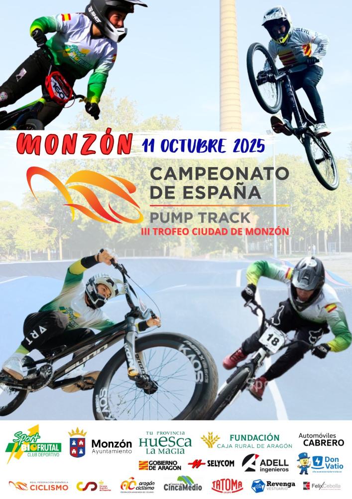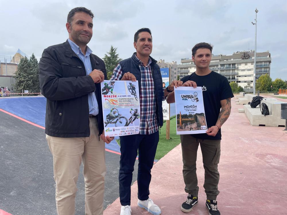 El concejal de Deportes del Ayuntamiento de Monzón, Eliseo Martín, el presidente del club Sport Biofrutal, Marcos Barranco, y el responsable de Unreal Bike Show, Ignasi Pascual, han presentado este viernes en la pista del Parque de la Azucarera el Campeonato de España de Pump Track individual “Ciudad de Monzón”, que se celebrará el día 11 de octubre, a partir de las 11:00h, con unos 200 participantes.
