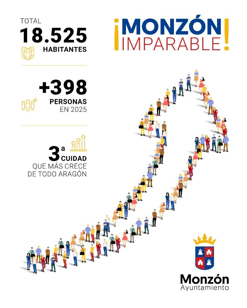 El Instituto Nacional de Estadística (INE) ha publicado los datos definitivos del padrón de habitantes correspondientes a 1 de enero de 2025, que sitúan a Monzón con 18.525 habitantes como la tercera localidad que más ha crecido en Aragón, tras Zaragoza y Huesca, manteniéndose con holgura como la segunda ciudad de la provincia de Huesca.