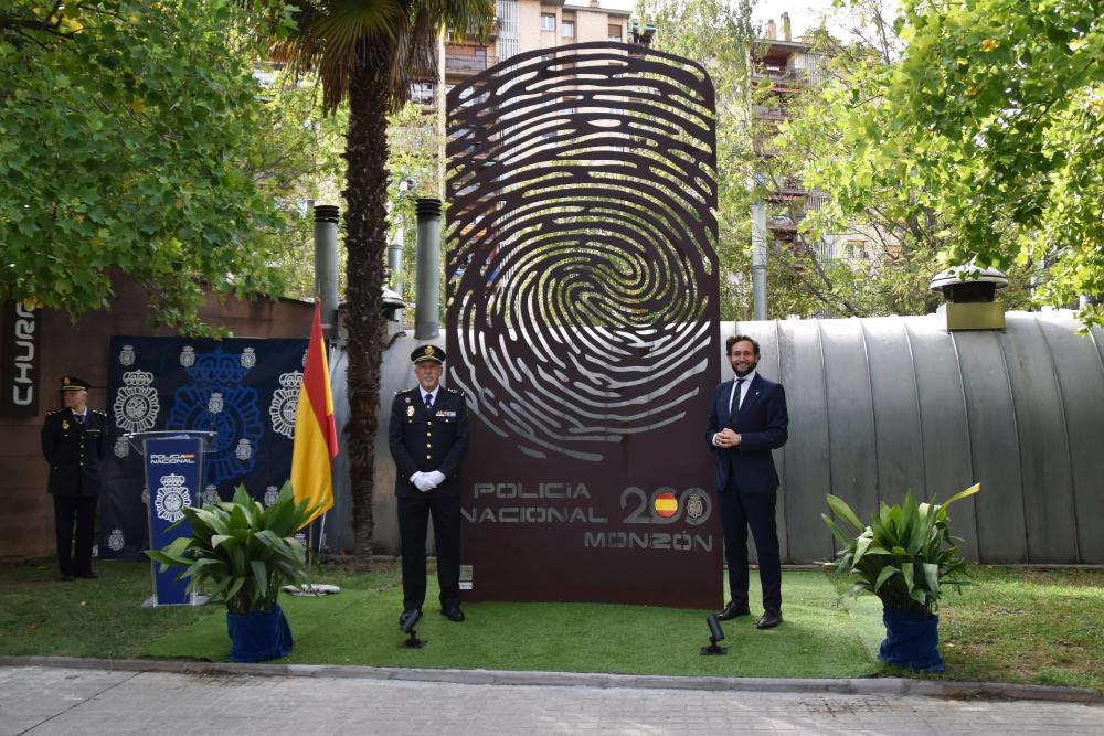 El alcalde de Monzón, Isaac Claver, y el jefe superior de la Policía Nacional en Aragón, Florentino Marín han descubierto la escultura “Huella”, este viernes en la Plaza Aragón (Parque de la Churrería) para reconocer el trabajo de este cuerpo de seguridad en el marco del bicentenario de su creación. Un acto en el que ha participado, también, el comisario provincial de Huesca, Luis Fernando Ascaso.
