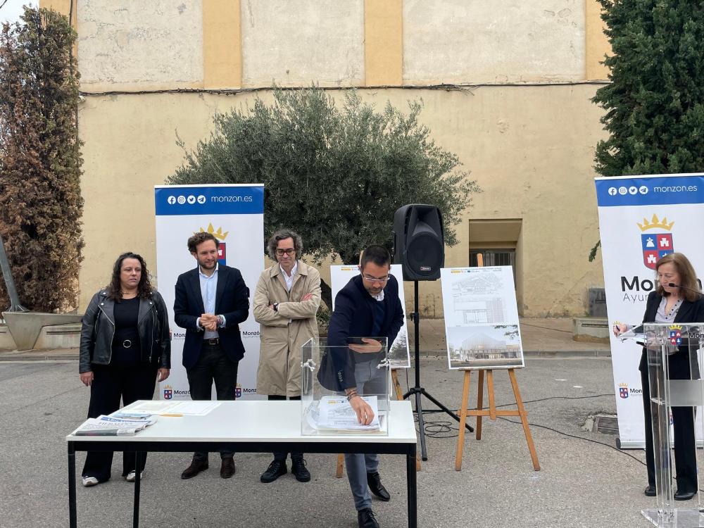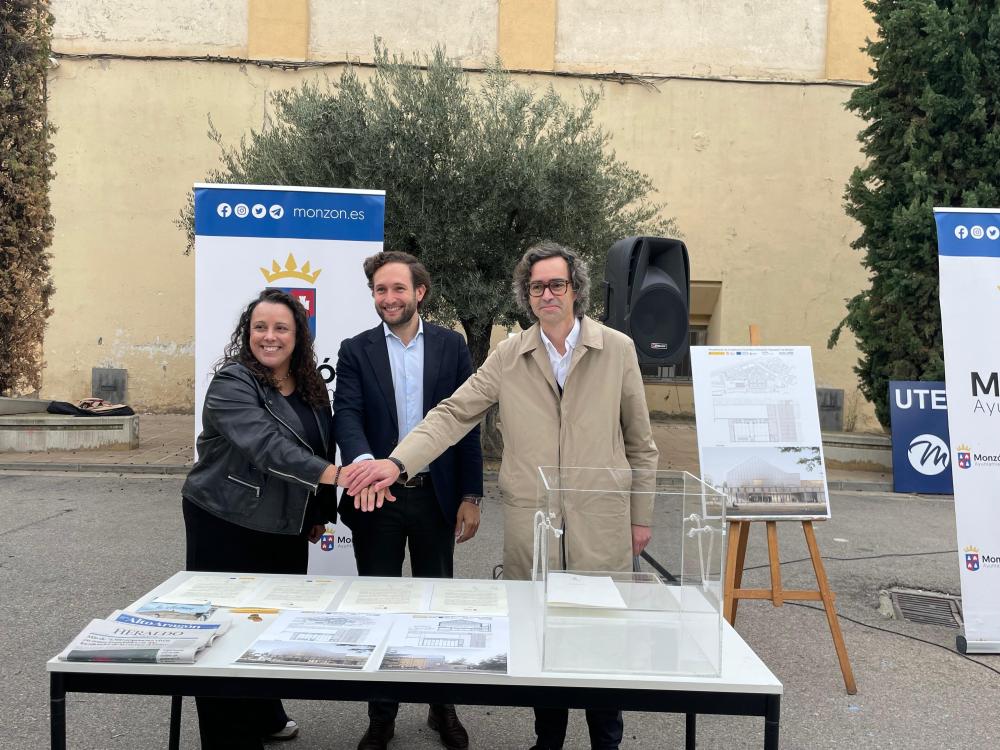 El alcalde de Monzón, Isaac Claver, el arquitecto Jorge Tárrago, y la representante de la UTE, Raquel Galiano, han firmado este lunes el acta de inicio de los trabajos y colocación de la primera piedra de las obras de rehabilitación de la Institución Ferial-nave polivalente- Azucarera de Monzón que cuenta con un presupuesto de 4.230.464,37€ y un plazo de ejecución de un año y medio aproximadamente, estando prevista su finalización en marzo de 2026.