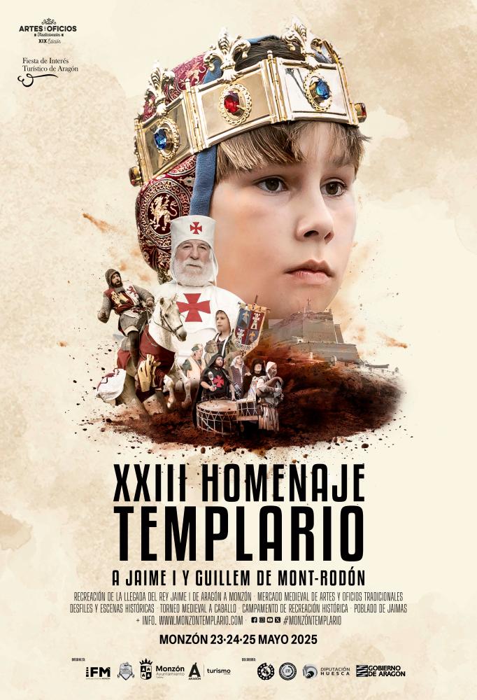 El alcalde de Monzón, Isaac Claver, los concejales de Turismo, Marta Montaner Durán, y Ferias, Jairo Sánchez, y representantes del Homenaje han presentado esta mañana en el Salón Azul del Ayuntamiento el programa de actos de la XXIII edición del Homenaje Templario a Jaime I y Guillem de Mont-rodón, que se celebrará del 23 al 25 de mayo, junto a la XIX edición de la Feria de Artes y Oficios Tradicionales.