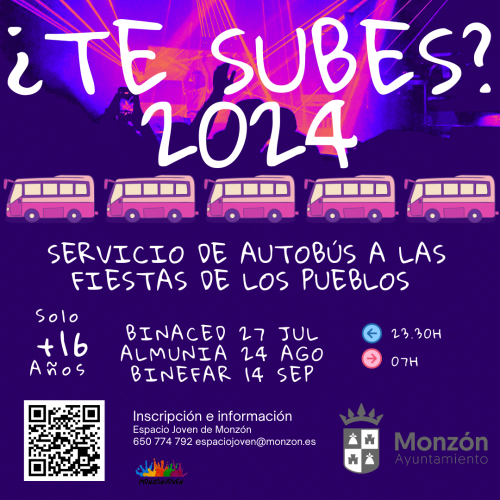 Las concejalías de Juventud y Familia del Ayuntamiento de Monzón activan el programa ¿Te subes?, consistente en un servicio gratuito de autobuses para jóvenes de 16 a 30 años, que se desplacen a las fiestas de Binaced, Almunia de San Juan y Binéfar y el reparto de un díptico de sensibilización sobre el consumo de alcohol “Disfruta la fiesta”.