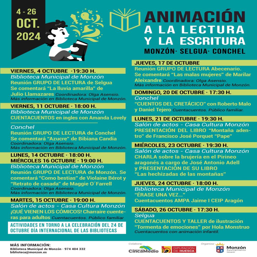 Cuentacuentos, reunión del Grupo de lectura, presentaciones de libros y charlas en torno al día 24 de octubre, Día Internacional de las Bibliotecas.