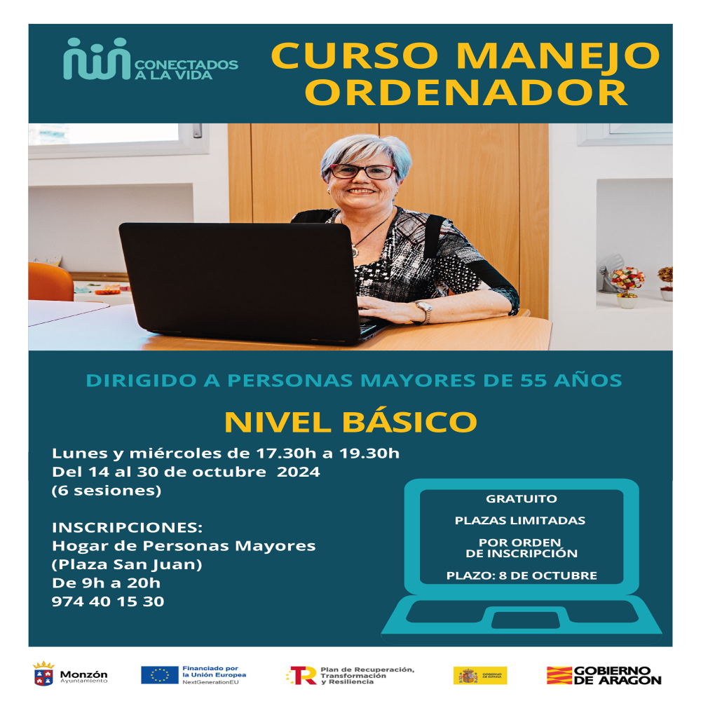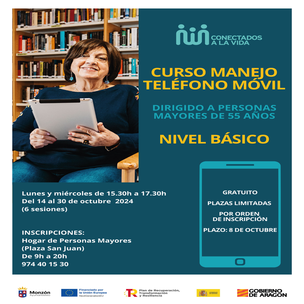 La concejalía de Familia y Mayores del Ayuntamiento de Monzón, en colaboración con el Instituto Aragonés de Servicios Sociales, pone en marcha, por segundo año los cursos de formación sobre el manejo del teléfono móvil y de ordenador, en el marco del programa “Conectados a la Vida” del Plan de Mayor. Abierto el plazo de inscripción hasta el día 8 de octubre.