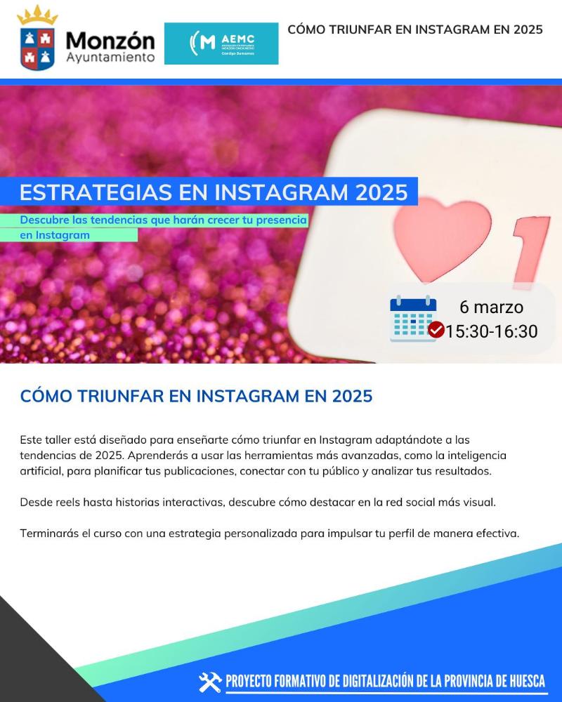 CÓMO TRIUNFAR EN INSTAGRAM EN 2025. Descripción:” este taller está diseñado para enseñarte cómo triunfar en Instagram adaptándote a las tendencias de 2025. Aprenderás a usar las herramientas más avanzadas, como la inteligencia artificial, para planificar tus publicaciones, conectar con tu público y analizar tus resultados.