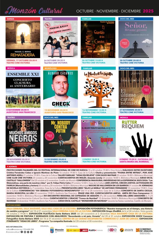 Sábado, día 13 de diciembre, a las 19:00h, en el Auditorio San Francisco, Concierto de Navidad: Banda La Lira, Coral Montisonense, Grupo Folklórico de Nuestra Señora de la Alegría y el Coro Góspel de la Escuela de Música Moderna de Monzón (EMMMO).