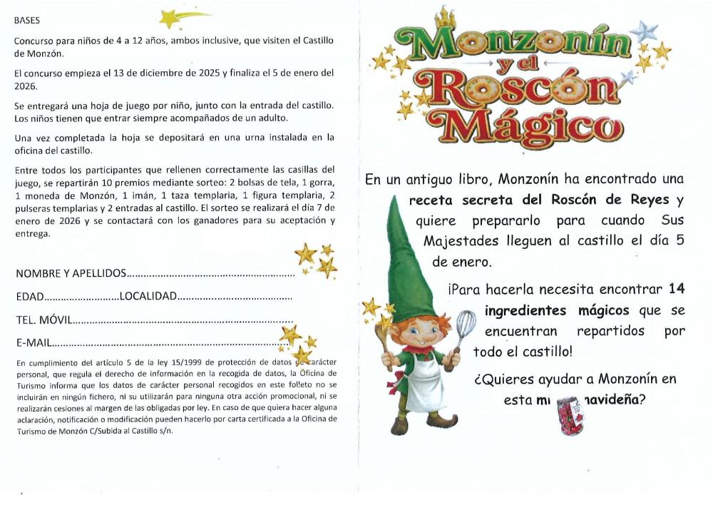 El juego está destinado a niños de 4 a 12 años y arranca este sábado hasta el día 5 de enero. Los niños recibirán con la entrada del castillo, siempre tienen que estar acompañados por un adulto, una hoja de juego que deberán cumplimentar y depositar en una urna instalada en la oficina de la fortaleza.
