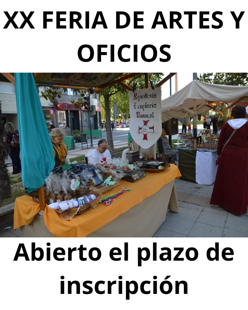 Monzón celebra la XX edición de la Feria de Artes y Oficios Tradicionales los días 23 y 24 de mayo en el marco del XXIV Homenaje Templario a Jaime I y Guillem de Mont-rodón, que está declarado fiesta de Interés Turístico Nacional. La concejalía de Ferias ha abierto el plazo para solicitar un puesto hasta el día 8 de febrero. La asignación se realizará del 9 al 22 de marzo.